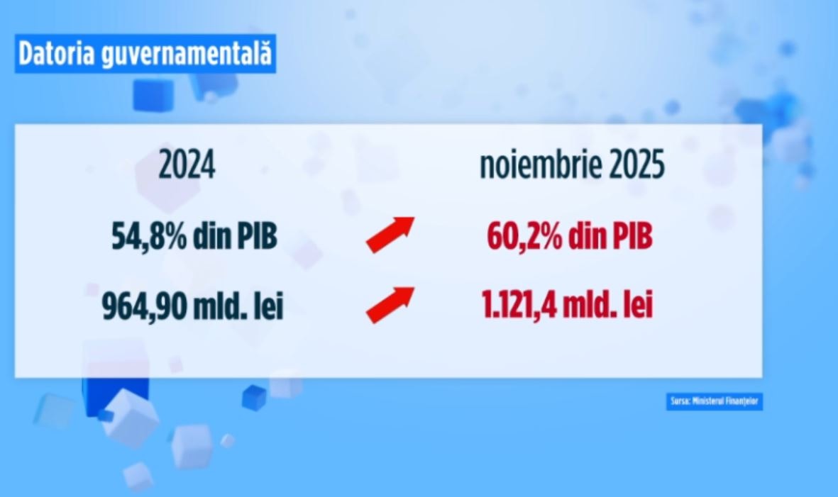 În noiembrie 2025, România a înregistrat o datorie publică guvernamentală de 60,2% din PIB, conform Ministerului Finanțelor.
