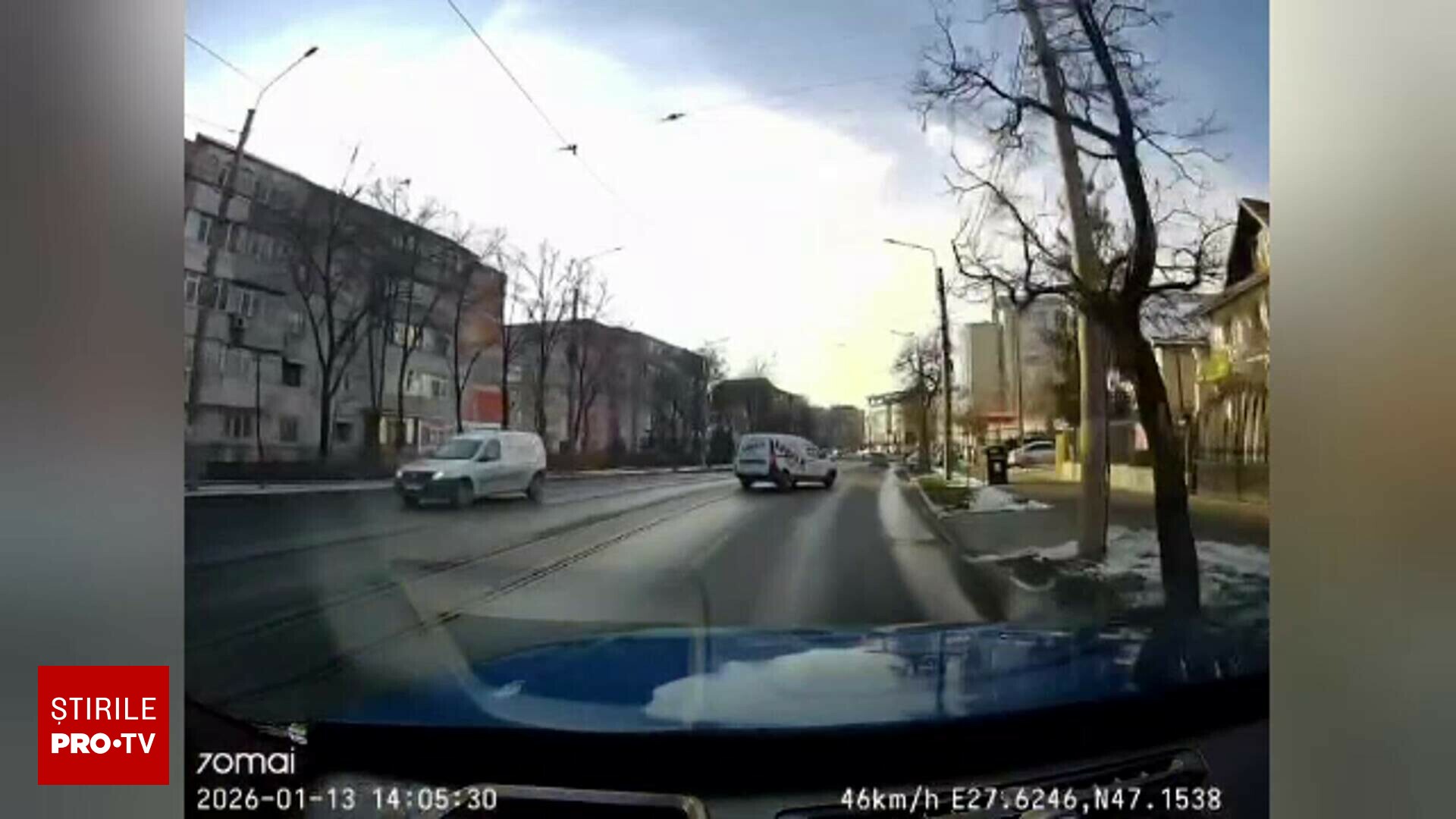 În Iași, un șofer a fost filmat de o cameră de bord în timp ce depășea periculos pe linia de tramvai, în condiții de carosabil înghețat. Manevra promptă de a reveni pe carosabil a dus la pierderea controlului vehiculului.